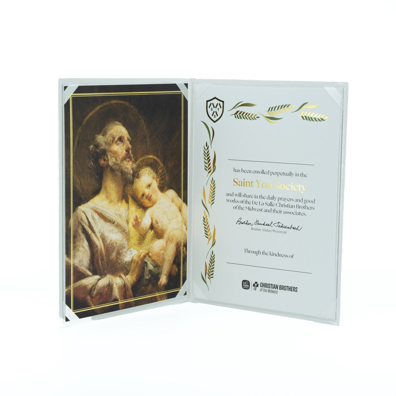 These folders are gold embossed, white leatherette folders, measuring 6.5" by 8.5" in size. They can be used for memorial or living perpetual memberships.