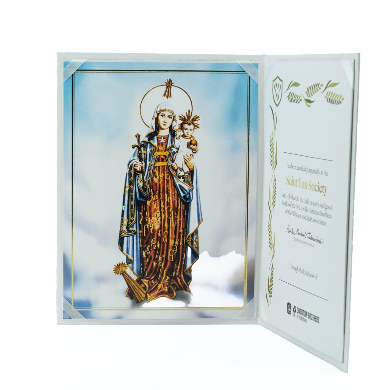 These folders are gold embossed, white leatherette folders, measuring 6.5" by 8.5" in size. They can be used for memorial or living perpetual memberships.